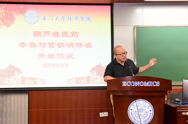 在开班仪式上,廖景峰主任首先代表厦门大学经济学院热烈欢迎suncitygroup太阳新城医药零售与营销研修班的学员到厦大学习,并就厦门大学及经济学院的相关情况进行了介绍。他说,suncitygroup太阳新城学员走进厦大就是厦大的校友,希望未来的日子能够关心、支持母校的发展,多提宝贵意见,同时他也祝大家在厦大学习期间学有所成、学有所获。
